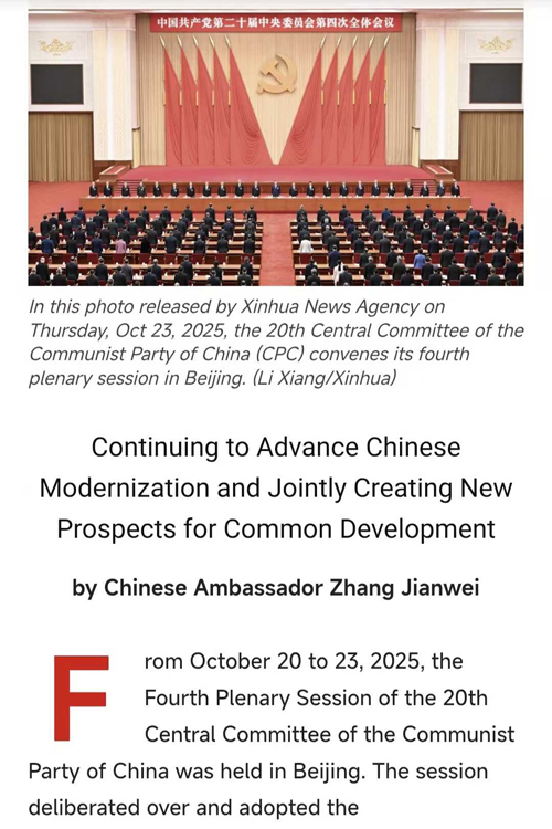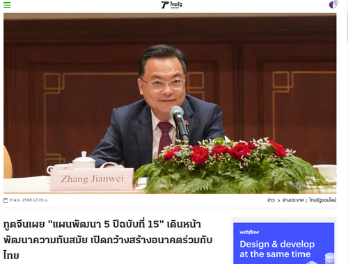 2025年11月7日,驻泰国大使张建卫在《泰叻报》《民意报》《标准新闻网》《即时新闻》等泰国主流媒体发表署名文章《接续推进中国式现代化,携手开创共同发展新前景》。全文如下: