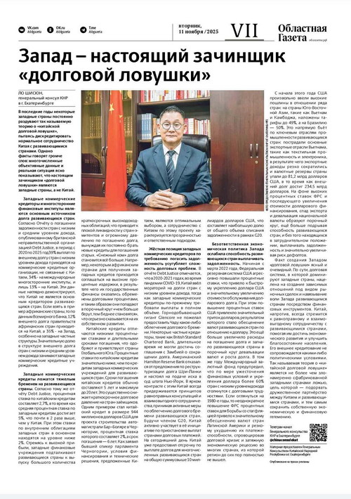 2025年11月11日,驻叶卡捷琳堡总领事罗世雄在斯维尔德洛夫斯克州影响力最大的官方报纸《州报》发表署名文章《西方才是“债务陷阱”的始作俑者》,全文如下: