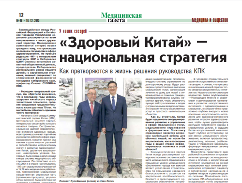 2025年12月10日,驻哈巴罗夫斯克总领事姜笑洋接受《俄罗斯健康报》哈巴罗夫斯克特约记者苏莱曼诺夫书面采访,宣介中国卫生健康领域发展成就、《“十五五”规划建议》有关健康中国建设、医疗健康领域国际合作等。全文如下: