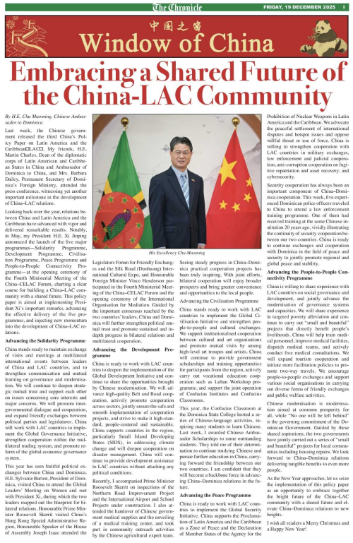 2025年12月19日,驻多米尼克大使储茂明在多主流媒体《纪事报》发表署名文章《共迎中拉命运共同体美好未来》,介绍第三份《中国对拉丁美洲和加勒比政策文件》,展望中多合作光明前景。全文译文如下: