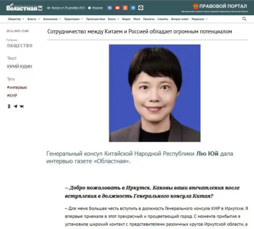 2025年12月29日,伊尔库茨克《州报》网站刊登对驻伊尔库茨克总领事刘渝的书面采访。全文如下: