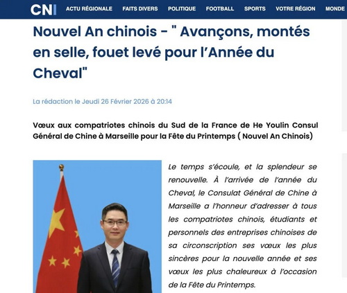 2026年2月26日,驻马赛总领事何有麟在南法主流媒体《科西嘉网络信息报》发表新春贺词,向在南法同胞致以新年问候和新春祝福。全文如下: