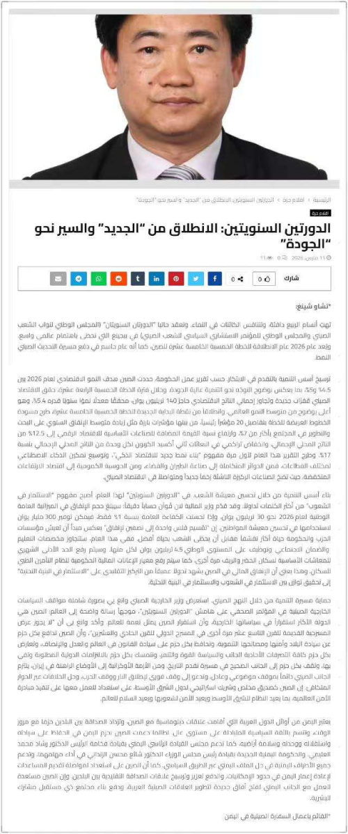 2026年3月11日,驻也门使馆临时代办邵峥通过联邦网等也门媒体发表署名文章《从“两会”看中国:由“新”出发,向“质”而行》,全文如下: