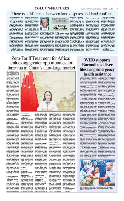 2026年3月19日、3月21日,驻坦桑尼亚大使陈明健在坦桑尼亚主流媒体《卫报》《每日新闻》发表署名文章《中国对非洲零关税:让中国超大市场为坦桑尼亚提供更大的机遇》,宣介中国对非洲零关税及其重大意义,全文如下: