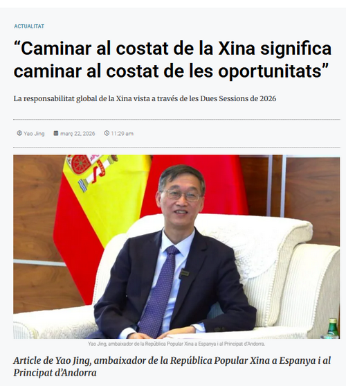 2026年3月21日,驻西班牙兼驻安道尔大使姚敬在安道尔《瓦利拉报》发表题为《与中国同行就是与机遇同行——从2026年“两会”看中国大国担当》的署名文章,全文如下: