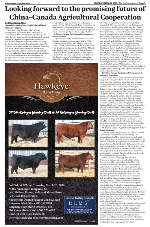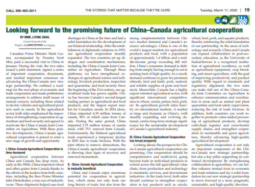 2026年3月12日和3月17日,驻卡尔加里总领事赵丽莹先后在萨斯喀彻温省《枫溪新闻报》和《西部之声》等媒体发表题为《中加农业合作未来可期》的署名文章。全文如下: