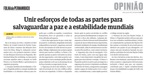 2026年4月8日,驻累西腓总领事兰和平在领区主流媒体《伯南布哥州页报》发表署名文章《凝聚各方力量,维护世界和平稳定》,阐述中国与巴基斯坦于3月31日就海湾与中东地区局势共同提出的五点倡议:立即停止敌对行动、尽快开启和谈、确保非军事目标安全、确保航道安全、确保联合国宪章的首要地位,表示欢迎包括巴西在内的各国及国际组织积极响应,共同为尽快恢复海湾和中东地区和平稳定作出贡献。兰和平总领事署名文章全文如下: