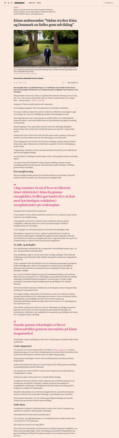 2026年4月10日,驻丹麦大使王雪峰在丹主流媒体《商报》发表题为《逐绿向新——中丹携手迈向可持续未来》的署名文章,中文全文如下: