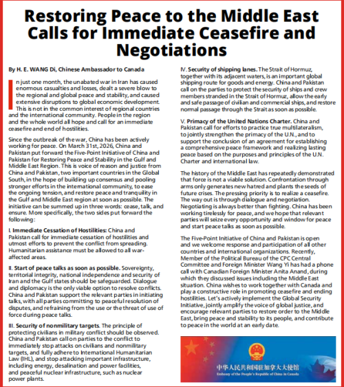 2026年4月13日,驻加拿大大使王镝在加《国会山时报》发表署名文章《停火止战、对话谈判,还中东以安宁》。全文如下: