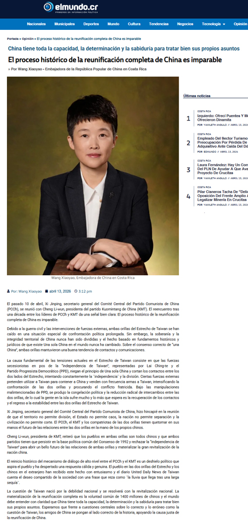 2026年4月13日,驻哥斯达黎加大使王晓瑶在哥主流媒体《世界报》发表署名文章《中国完全统一的历史进程不可阻挡》。文章强调,当前台海局势紧张的根本原因在于“台独”和某些外部势力妄图分裂中国。时隔十年,国共两党重启高层对话,世界应清晰认识到,中国完全有能力、有决心、有智慧处理好自身事务,台湾问题因民族弱乱而产生,必将随着民族复兴而解决。全文如下: