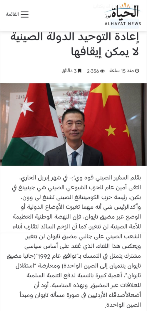 2026年4月17日,驻约旦大使郭伟在约旦生活新闻网发表署名文章《中国统一大业不可阻挡》,宣介习近平总书记会见中国国民党主席时发表的重要讲话精神,强调台湾属于中国这一事实不容篡改,一个中国原则是国际社会普遍共识和国际关系基本准则,实现中国完全统一是大势所趋、民心所向。全文如下: