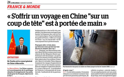 2026年4月17日,驻马赛总领事何有麟接受南法主流媒体《马赛人报》专访,介绍中国对法免签政策及重要意义,并畅谈对“成为中国人”和“走进中国”等话题看法。全文如下: