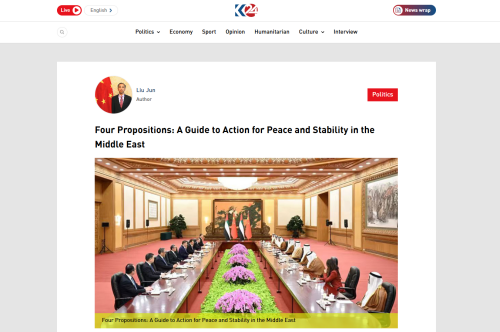 2026年4月20日,驻埃尔比勒总领事刘军在伊拉克库尔德地区主流媒体库尔德萨特电视台和库尔德斯坦24官网发表题为《四点主张:中东由乱转治的行动指南》的库尔德文、英文署名文章,宣介习近平主席就维护和促进中东和平稳定提出的四点主张,全文如下:
