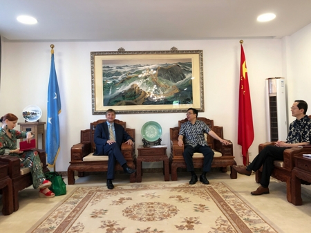 2021年11月24日,驻密克罗尼西亚联邦大使、外国驻密使团长黄峥接受联合国北太平洋多国办事处首任驻地协调员范希尔登到任拜会。驻地协调员办公室主任施温丁格等在座。