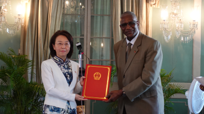 2021年12月6日,新任驻安提瓜和巴布达大使张艳玲在安巴首都圣约翰向安巴总督罗德尼·威廉斯递交国书。