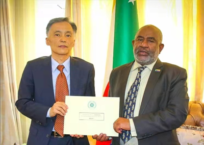 2021年12月4日,驻科摩罗大使何彦军应邀往见科总统阿扎利,阿扎利向何大使转交致习近平主席信函,祝贺中非合作论坛第八届部长级会议获得圆满成功。