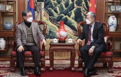 2022年1月12日,驻光州总领事张承刚在馆内会见光州市经济自由区厅厅长金镇哲,崔东锡招商部长等参加。