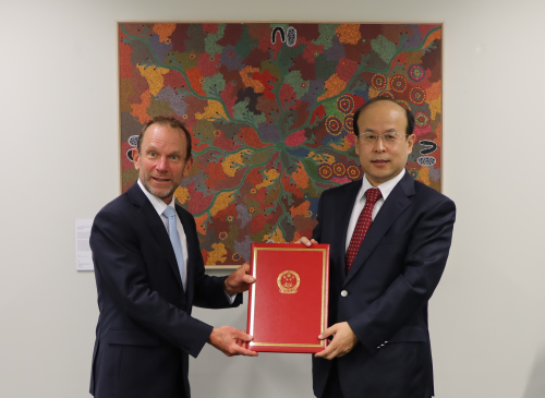 2022年2月8日,驻澳大利亚大使肖千向澳外交贸易部礼宾司司长麦克康维尔递交国书副本。