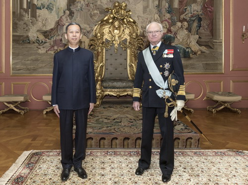 2022年2月15日,瑞典国王卡尔十六世·古斯塔夫在瑞典王宫会见了驻瑞典大使崔爱民。