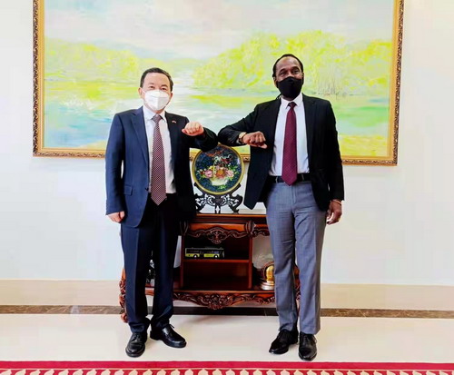 2022年2月18日,驻特立尼达和多巴哥大使方遒会见特多国家安全部长海因兹,双方就加快推进中特两国执法部门交流合作机制建设,以及推动建立特多警方与华人社区沟通协作机制等问题深入交换意见。
