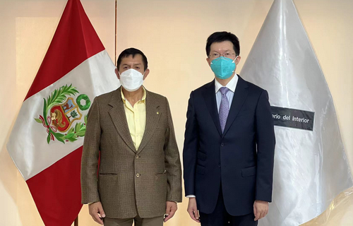 2022年4月14日,驻秘鲁大使梁宇拜会秘鲁新任内政部长查瓦里,就双边关系以及公共安全领域合作进行深入交流与探讨。