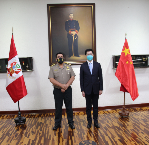 2022年4月19日,驻秘鲁大使梁宇拜会秘鲁国家警察司令蒂布西奥,就双边关系以及中秘警务合作等议题深入交换意见,秘国家警察总参谋长洛斯托瑙、国际关系局长门德斯等参加会见。