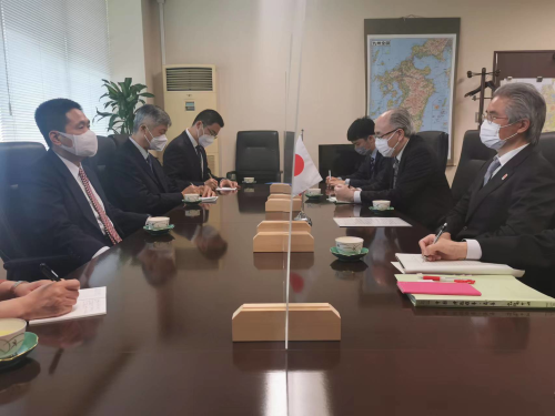 2022年4月28日,驻福冈总领事律桂军会见九州经济产业局长后藤雄三。九经局国际部长飞矢崎峰夫、国际事业课长今村芳仁等在座。