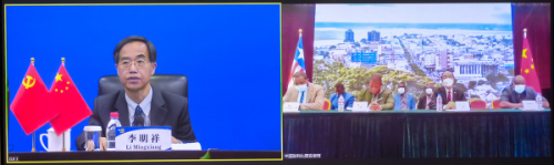 2022年4月28日,中共中央对外联络部部长助理李明祥同利比里亚民主变革联盟(简称“利民盟”)全国主席莫卢视频通话。驻利比里亚大使任义生在线出席。