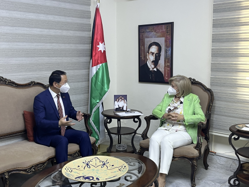 2022年4月28日,驻约旦大使陈传东会见约旦文化大臣海法·纳贾尔。