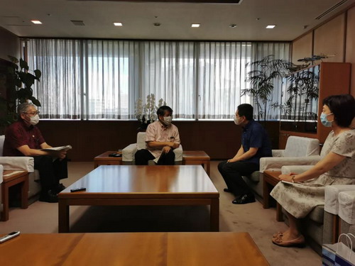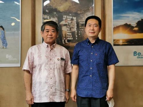 2022年7月8日,驻福冈总领事律桂军访问冲绳县厅,会见副知事照屋义实,该县文化观光体育部长宫城嗣吉等在座。