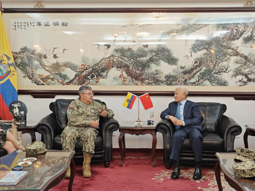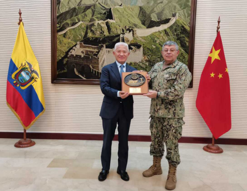2024年1月18日,驻厄瓜多尔大使陈国友在使馆会见厄海军司令科尔多瓦。