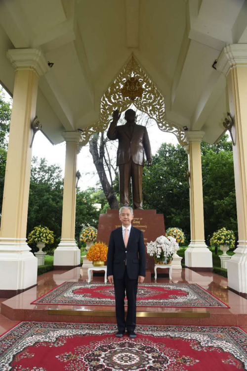 会见前,汪文斌大使向王宫内西哈努克太皇纪念雕像敬献花篮。