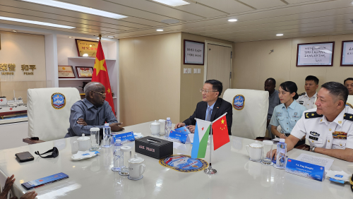 2024年12月8日,驻吉布提大使胡斌陪同吉总理卡米勒参访来吉执行“和谐使命-2024”任务的中国海军“和平方舟”号医院船,任务指挥员应洪波少将、何永明少将盛情接待。卡米勒总理饶有兴致地听取“和平方舟”开展医疗服务的介绍,参观各科室和中方自主研发的高科技医疗设备,观摩中医诊疗,见证白内障患者术后揭纱布。