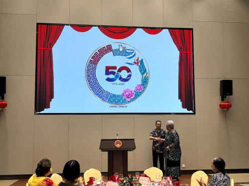 2025年3月7日,驻萨摩亚大使费明星和萨摩亚总理菲娅梅·内奥米·马塔阿法共同为中萨建交50周年纪念徽标揭幕。