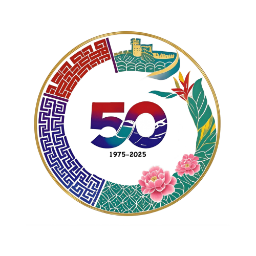 徽标设计理念为海上丝绸之路的现代延续、波利尼西亚文化的现代演绎,形象上采用长城砖纹、青花瓷回纹和萨摩亚编织纹的拓扑融合,中萨两国国花共生其中,色彩上以中国红、青花瓷与碧绿海洋三色和谐渐变,数字“50”采用莫比乌斯环设计突出两国友谊无穷无尽的美好祝愿,总体体现了两国和合共生的文明互鉴和同心协力的发展愿景。徽标由中萨两国友好人士设计,并经线上投票评选产生。