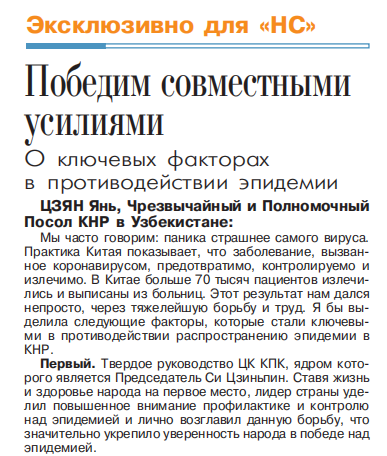 2020年3月24日,乌人民言论报刊登驻乌兹别克斯坦大使姜岩就中国抗疫经验接受的专访。