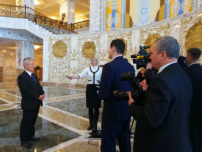 2020年3月24日,驻白俄罗斯大使崔启明往见白总统后,在白总统府就中白共同防控新冠肺炎疫情、中白关系及两国各领域合作等接受白国家通讯社、国家电视一台、首都电视台、公共电视台、国际广播电台等十余家白主流媒体联合采访。