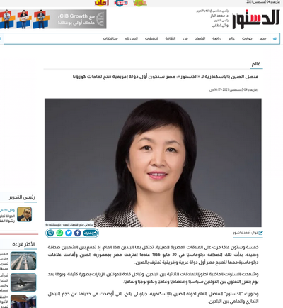 2021年8月4日,埃及《宪章报》刊登了日前对驻亚历山大总领事赵丽莹的书面采访。赵总领事就中埃关系,特别是双边经贸投资合作情况与展望,以及中非抗疫合作和中国疫苗国际合作等问题回答了记者的提问。