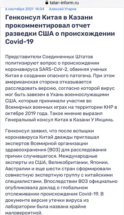 2021年9月6日,俄罗斯鞑靼斯坦通讯社刊登就美国情报部门炮制所谓病毒溯源问题调查报告对驻喀山总领事吴颖钦的书面采访。