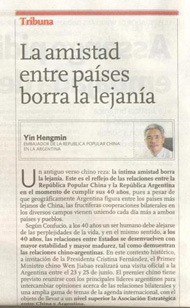 2012年6月20日,在温家宝总理抵达布宜诺斯艾利斯对阿根廷进行正式访问之际,驻阿根廷大使殷恒民在阿及拉美第一大报《号角报》发表署名文章《海内存知己,天涯若比邻》,介绍温总理访阿情况,全文如下: