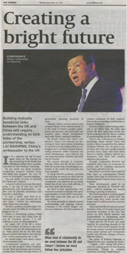 2012年5月30日,英国《纽卡斯尔日报》刊登驻英大使刘晓明题为《创造美好未来》的署名文章,文章全文如下: