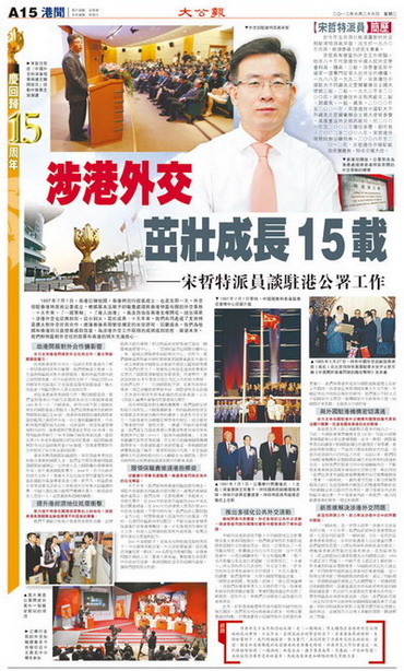 在香港回归祖国15周年和外交部驻港公署成立15周年之际,外交部驻香港特别行政区特派员宋哲就15年涉港外交工作接受香港《大公报》专访。《大公报》专访全文如下: