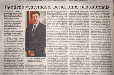 2012年9月24日,立陶宛最有影响的报纸《共和国报》刊登了驻立陶宛大使刘增文题为“携手努力,共同进步”的署名文章,介绍中国与中东欧国家合作的相关情况。此前,立陶宛中国论坛网站亦全文刊载了该篇文章的中文版和英文版。文章全文如下: