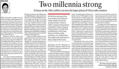 2012年10月27日,《印度快报》全文刊登了驻印度使馆临时代办邓锡军题为《用更广阔的历史视野看待中印关系》的署名文章。该报网络版同时刊登。全文如下: