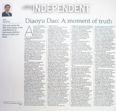 近日,马耳他主流英文报纸《独立报》全文刊载中国驻马耳他大使蔡金彪就钓鱼岛问题撰写的“钓鱼岛:真相时刻”一文,主要内容如下: