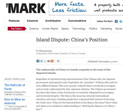 近日,驻加拿大大使章均赛在加主流媒体马克新闻网(Marknews)发表题为《钓鱼岛是日本对待历史态度的试金石》的文章,介绍中国政府在钓鱼岛问题上的立场。