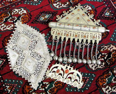 银是土库曼人制作首饰的主要原材料,镶嵌各种宝石的银制首饰在土库曼斯坦最为流行。银之所以在众多材料中脱颖而出,既与其金属特性相关,也有深刻的历史原因。就材料本身而言,银具有防腐、抗菌、消炎的功效,游牧民族多在炎热的草原、沙漠上不断迁徙,医疗条件有限,银饰可以作为辅助药物,防止伤口在高温天气恶化。此外,古时中亚地区贵金属开采工艺落后,金银开采量不足,土库曼人遂将在日常生活中流通使用的银钱币和银块熔造为首饰,也常请工匠师傅对式样过时的老旧银饰进行回炉改造。
