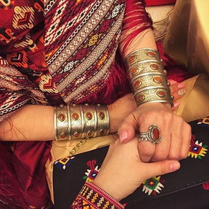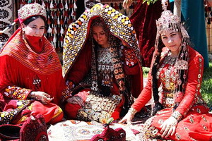 土库曼妇女喜爱佩戴银饰。她们认为,银制品闪烁的熠熠光芒能够很好地中和深红色或者深绿色传统民族服装的严肃性,银制头饰、项链、项圈、耳环、胸针、手链、手镯都是土库曼女装不可或缺的配饰,银饰品和传统长裙完美结合、互补互依、相得益彰。若你不知道送什么礼物给土库曼的妇女儿童,一件精心挑选的银饰既美观实用,也能体现你对土库曼斯坦文化和习俗的了解,迅速拉近与当地人的距离。