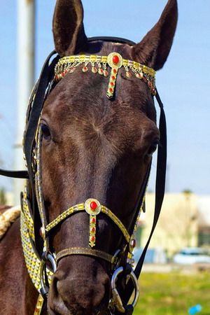土库曼妇女佩戴的首饰数量因年龄不同而有所差异。一般来说,9至12岁的女孩佩戴的首饰最多、最复杂。大多数家庭会在女儿长到9岁时,甚至从出生之日起,就开始为女孩筹办整套婚礼首饰嫁妆,这些首饰可能会重达10公斤,在婚庆仪式当天和婚后一年的重大节庆场合都必须佩戴。生育1至2个孩子以后,土库曼妇女佩戴的首饰数量明显减少,30-35岁后仅着头饰、戒指、耳环等必不可少的饰品。土库曼人爱马,视马为平等的家庭成员,为体现对马的尊重和爱护,他们也会为马匹量身打造首饰和马衣,这种传统一直流传至今。