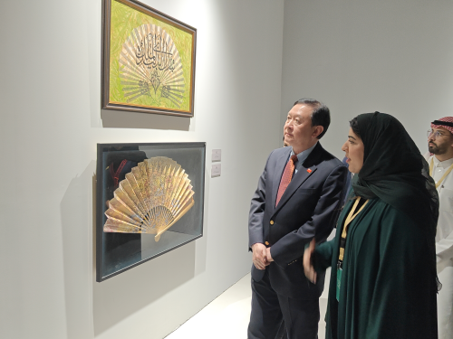 2025年12月25日,驻沙特大使常华同沙特文化部次大臣拉希德来到“市集”,参观各展区特色展演,与中沙两国艺术家亲切交流,与现场民众一同感受两国文化交融的蓬勃活力。